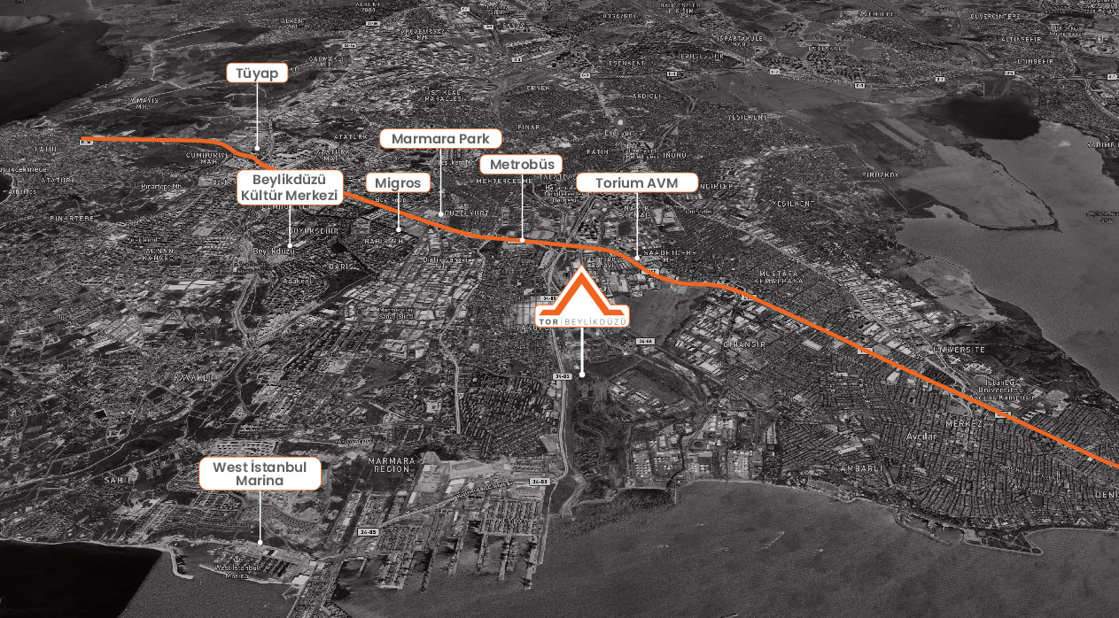 Providing easy access to all parts of Istanbul thanks to its proximity to the metrobus line, Tor Beylikdüzü is located only 4 kilometers away from the seaside and half an hour from the airport. You can enjoy your weekends by shopping at Torium AVM and Marmara Park within walking distance or participate in events held throughout the year at TUYAP and Beylikduzu Cultural Center. Besides, West Istanbul Marina is right next to you for sea lovers to safely moor their yachts.